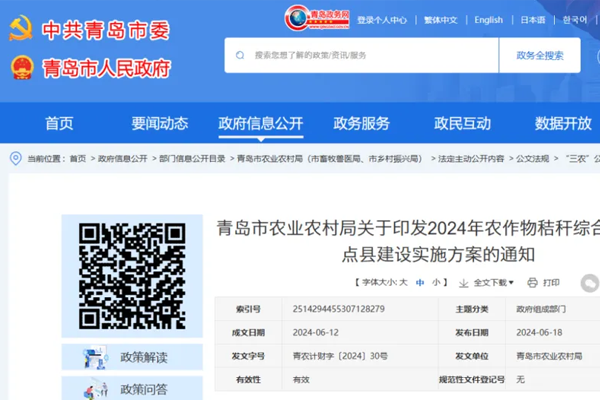 即墨区、胶州市、平度市农业农村局:《青岛市2024年农作物秸秆综合利用重点县建设实施方案》已经局党组会议研究同意,现印发给你们,请结合本方案,制定当地项目实施方