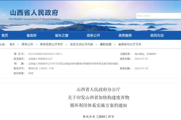 山西省人民政府办公厅关于印发山西省加快构建废弃物循环利用体系实施方案的通知晋政办发〔2024〕37号各市、县人民政府,省人民政府各委、办、厅、局:《山西省加快构
