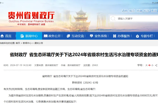 省财政厅 省生态环境厅关于下达2024年省级农村生活污水治理专项资金的通知省财政厅 省生态环境厅关于下达2024年省级农村生活污水治理专项资金的通知黔财资环〔2