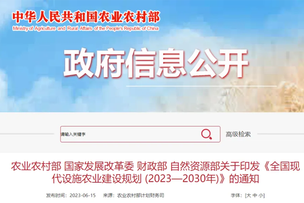 《全国现代设施农业建设规划(2023—2030年)》发布实施 本网讯 贯彻落实党的二十大精神和习近平总书记重要指示精神,近日,农业农村部联合国家发展改革委、财政