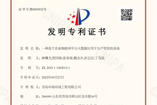 近日,由中海环境科研团队自主研发的《一种基于农业物联网平台大数据应用于生产管控的系统》正式