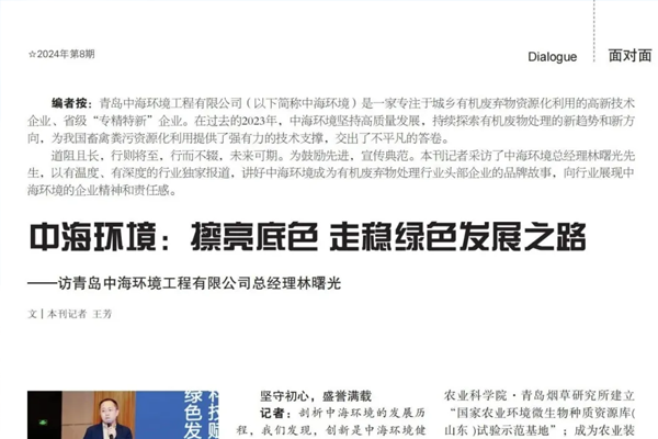 近日,青岛中海环境工程有限公司总经理林曙光先生接受了《中国畜牧业》期刊的专访。在采访中,林曙光先生介绍了中海环境在有机废弃物处理行业中的发展历程,并讲述独特的品